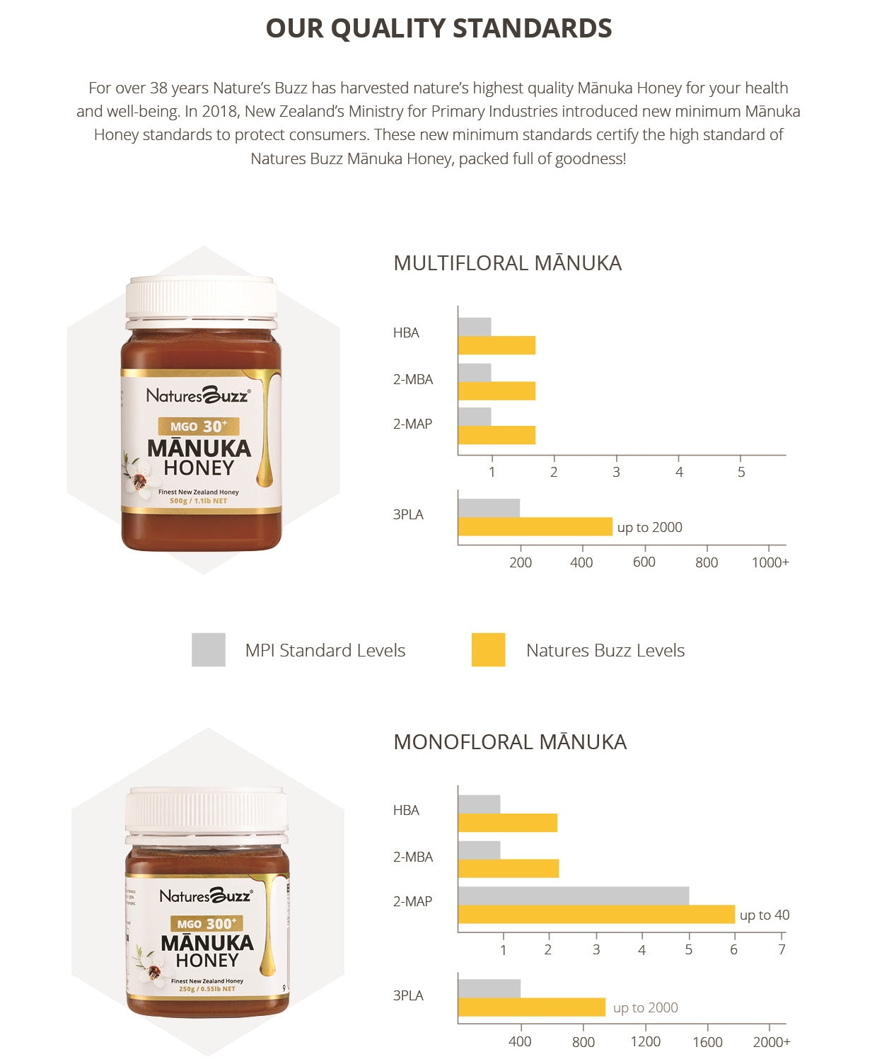 Natures Buzz medical-grade MGO Mānuka Honey is a must for your first aid kit for external use and perfect as a pantry staple for aiding in everyday health, coughs and colds, reflux, gut and bowel health and much more. Click here for more information on research papers.